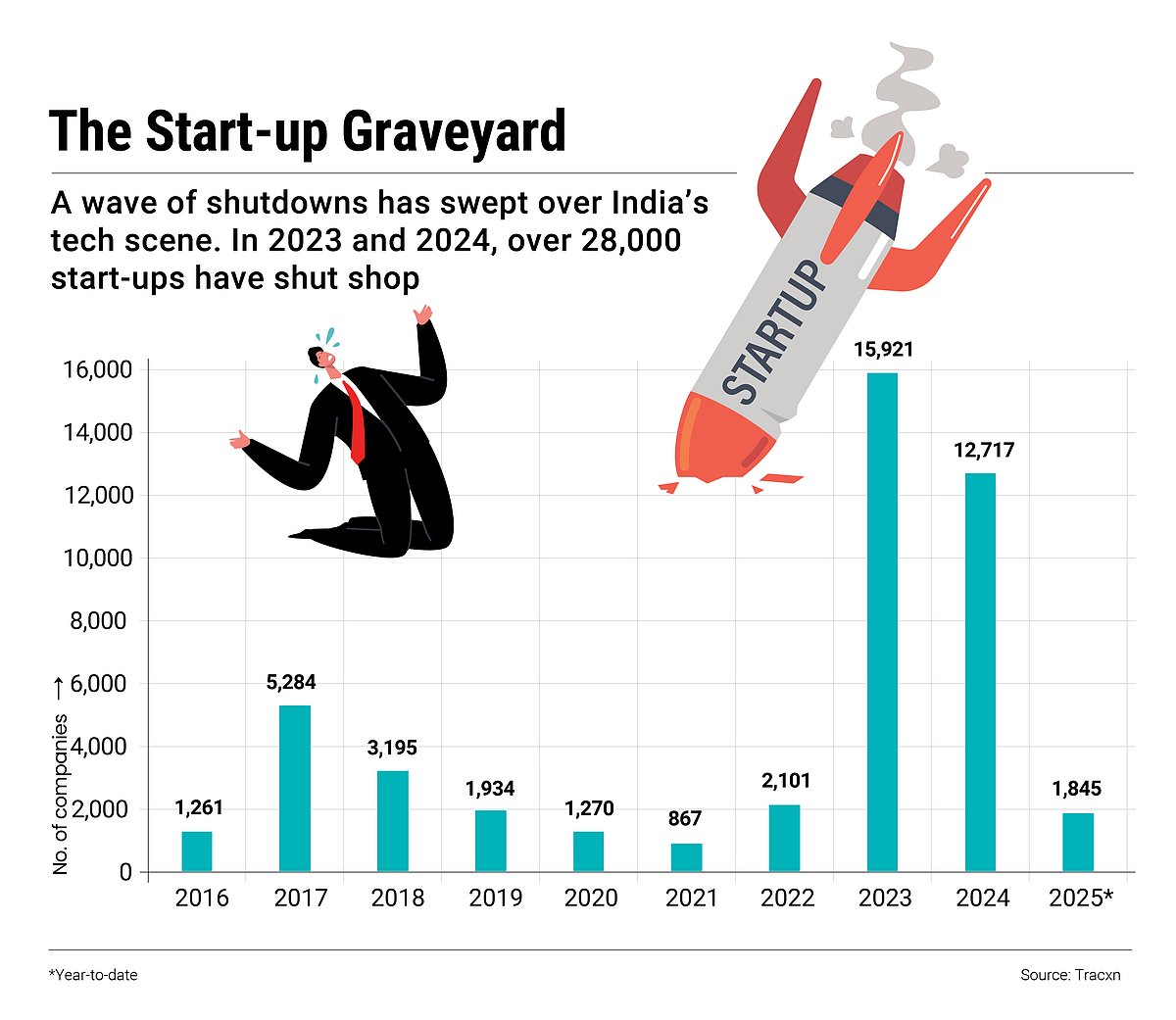 In 2023, the year after ChatGPT’s debut, 15,921 tech start-ups shut down in India, up from 2,101 the year before. The number was 12,717 last year.