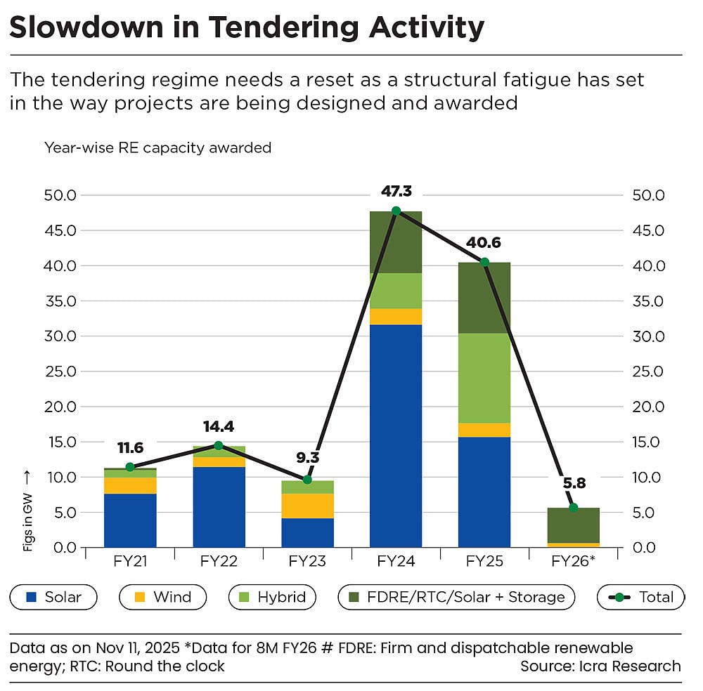 These structural and financial roadblocks have led to the pipeline collapsing to just 5.8GW of RE projects being awarded in the first eight months of 2025–26, according to a report by Icra, a credit-rating agency. This is a sharp fall from the record 47.3GW of clean energy capacity in 2023–24 and 40.6GW in 2024–25.