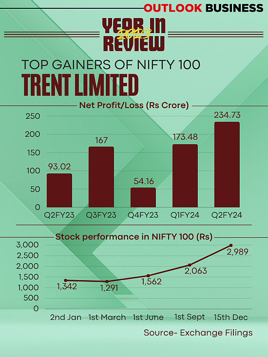 Tata Group's retail arm, Trent, experienced a remarkable upswing in its share price of more than 122 per cent. The financial strength was evident as Trent Ltd. reported a consolidated net profit of Rs 234.73 crore for the September quarter of FY24, showcasing a robust increase from the previous fiscal year.