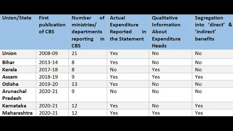 Moreover, there is a lack of standardisation of norms among government entities for reporting in their respective CBS. While some states include both ‘direct’ and ‘composite’ benefits[1] for children, others report actual audited expenditure on the schemes and programmes in addition to the outlays. The inconsistent reporting across different states precludes any meaningful comparison of the reported numbers and renders the CBS less effective as an accountability instrument. The matrix below provides a snapshot of how reporting is done in the CBS by the Union and State Governments.