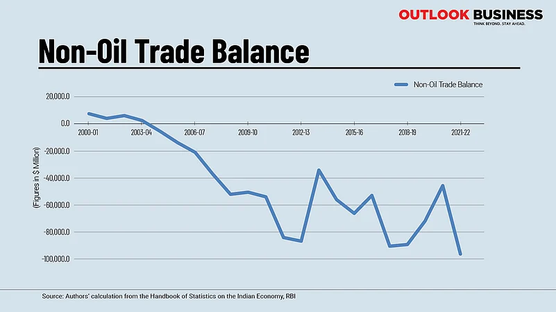 Starting with a positive trade surplus in the non-oil merchandise sector in early 2000s, India’s non-oil trade deficit had ballooned to around $100 billion in 2021-22.