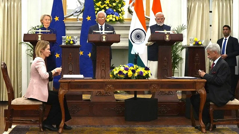 Prime Minister Narendra Modi, the President of the European Commission, Ursula von der Leyen, and the President of the European Council, António Luís Santos da Costa, witnessed the signing and exchange of the political declaration marking the conclusion of negotiations on the deal.