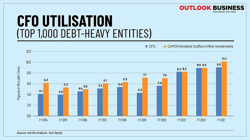 The gap between cash flow from operation (adjusted for interest payment) and committed spending (capex + dividend + other investments) has come down recently, with a likely modest pickup in FY24. This suggests that corporates are incurring capex without raising debt. Moreover, the data shows that corporates will need to take some leverage or spend on capex to ensure healthy ROE (return on equity) on a sustained basis.