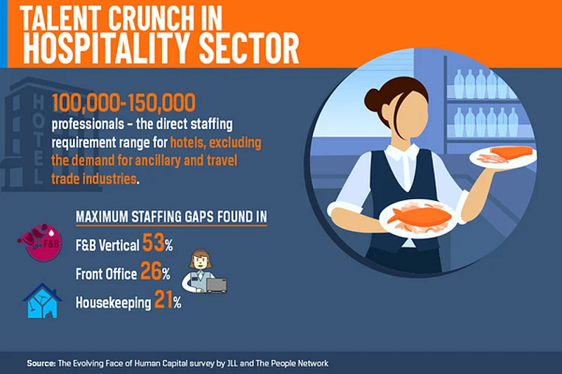 in the Hospitality Industry survey, conducted by JLL and The People Network, estimates that the direct manpower requirement for hotels is 100,000 to 150,000 professionals, excluding the demand for ancillary and travel trade industries. The report also found that the maximum staffing shortage is in the F&B vertical (53 per cent), followed by Front Office (26 per cent) and Housekeeping (21 per cent).