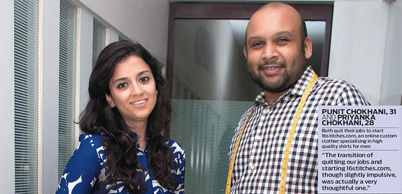 The story is somewhat similar for Punit Chokhani, who gave up a lucrative career in institutional equity research to start his own venture, 16stiches.com, an online custom clothier specialising in high quality shirts for men. Chokhani was not alone; he got his wife Priyanka who was working in an ad agency to join him in his venture. “At our age, responsibilities are less, and if you do not do it now, you will never do it,” he says.