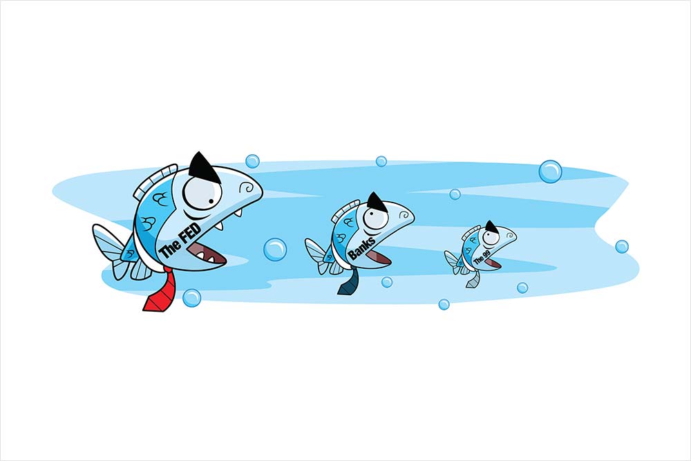 When examining the well-known wealth distribution triangle of land/labour/capital, the Wall Street food chain segregates capital between the haves and have-nots: The Fed and its member banks are the metaphorical whales, the small investors earning .01% on their money market funds are the plankton.