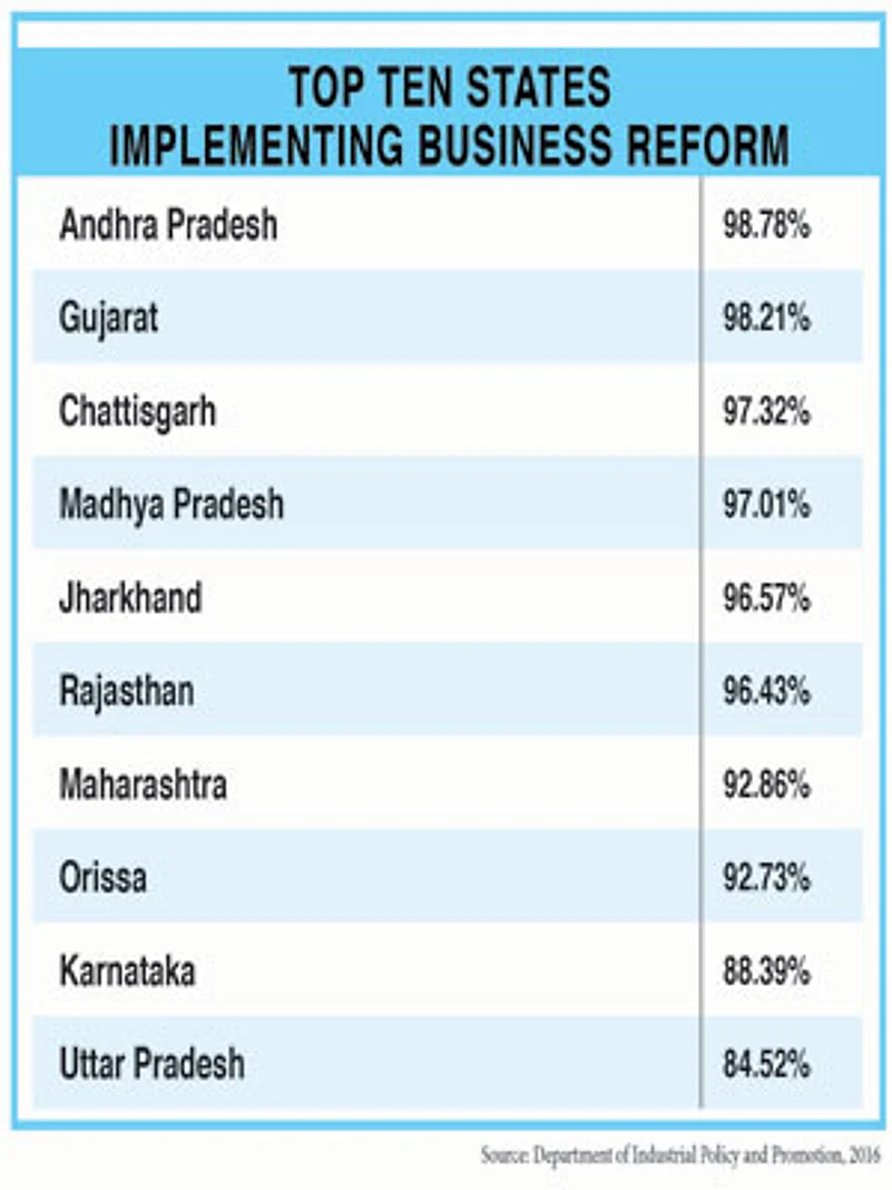 However, there is some positive news too. At least 32 state and union territory governments submitted evidence of implementation of over 7,000 reforms. A total of 6,069 reforms were approved and implemented. The national implementation average has increased from 32 per cent to 48.93 per cent. The result of the assessment demonstrates that states have increasingly risen to addressing the challenge of making it easier to do business.