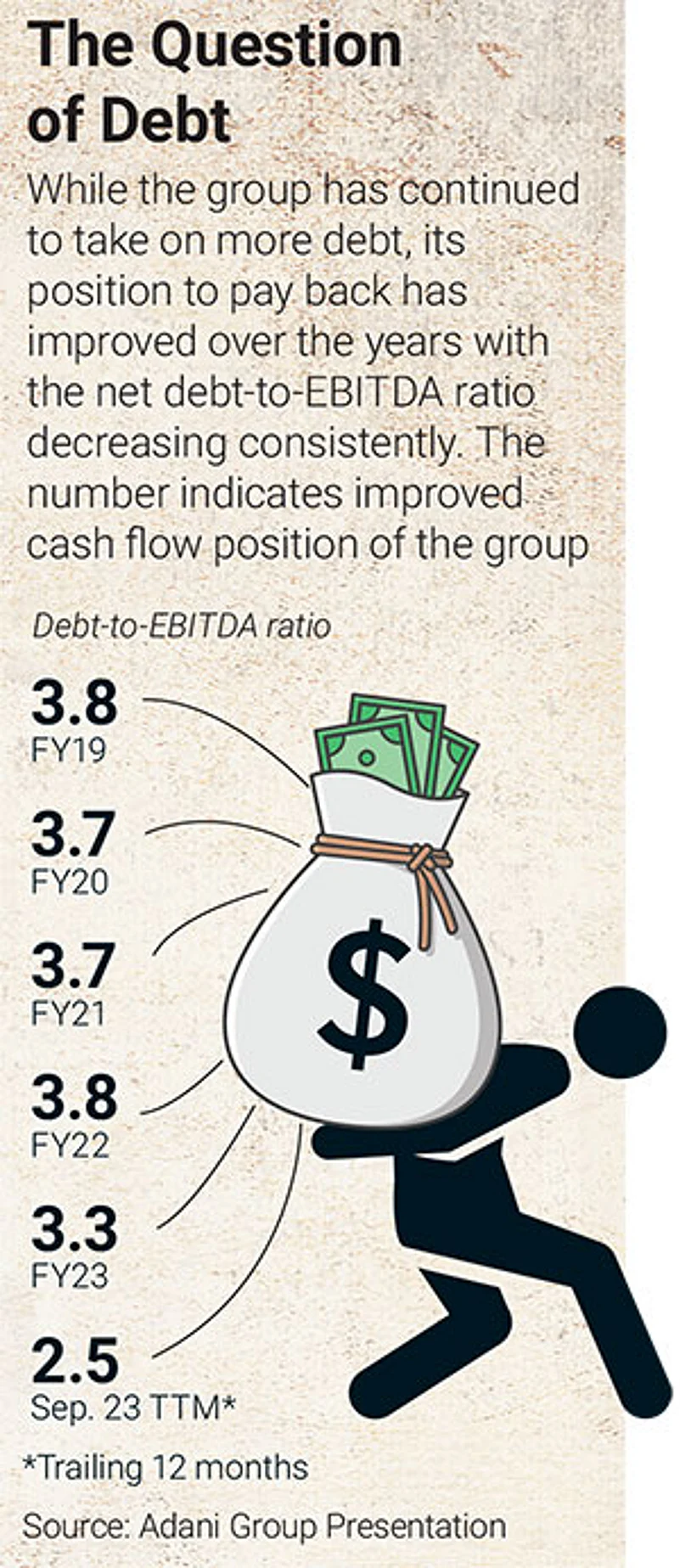 Following the concerns over its leverage, the group has repeatedly highlighted that its net debt to EBITDA ratio has constantly reduced in the last few years. From 3.8x in FY19, the net debt to EBITDA ratio came down to 2.5x in September 2023 for the trailing 12 months. Baliga says that he does not see debt repayment as a problem, but the concern is elsewhere. “While they will be able to manage their debt, valuation of some of the group stocks is a concern,” he says.