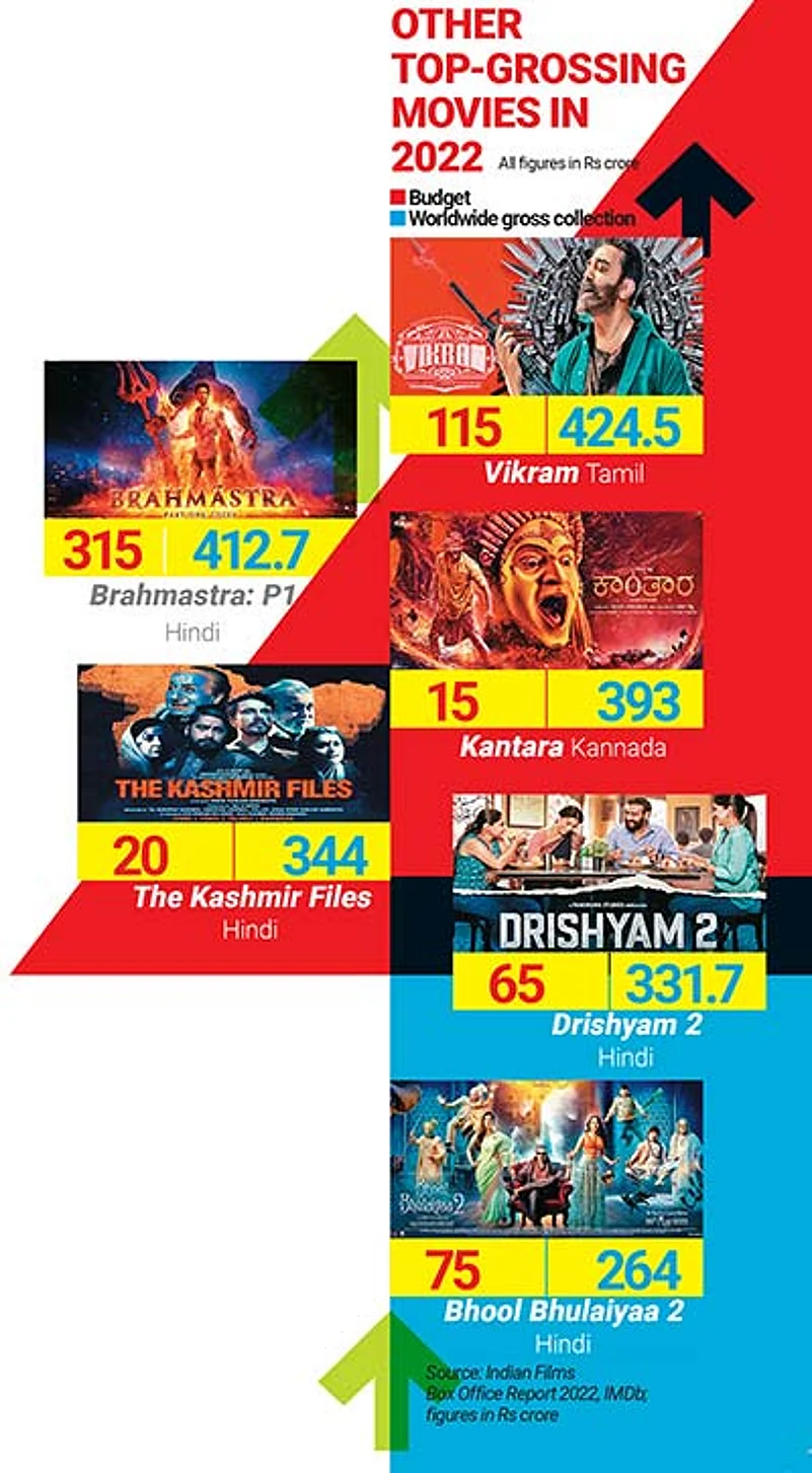 An analysis of the top-grossing films shows that budget or region does not seem to matter when it comes to its appeal. Laal Singh Chaddha, made on a scale of Rs 180 crore, managed to rake in worldwide gross of just around Rs 127 crore, of which Rs 57 crore was from the domestic market, as per an IMDb report. On the other hand, Kantara, with a meagre budget of Rs 15 crore and released just a month after Laal Singh Chaddha, made over Rs 393 crore worldwide, of which nearly Rs 190 crore came from the overseas market. The movie became the second-highest grossing Kannada film of all time after K.G.F: Chapter 2. Brahmastra, directed by Ayan Mukerji and co-produced by Dharma Productions, was made with a budget of around Rs 315 crore and earned approximately Rs 412 crore worldwide, as per IMDb.