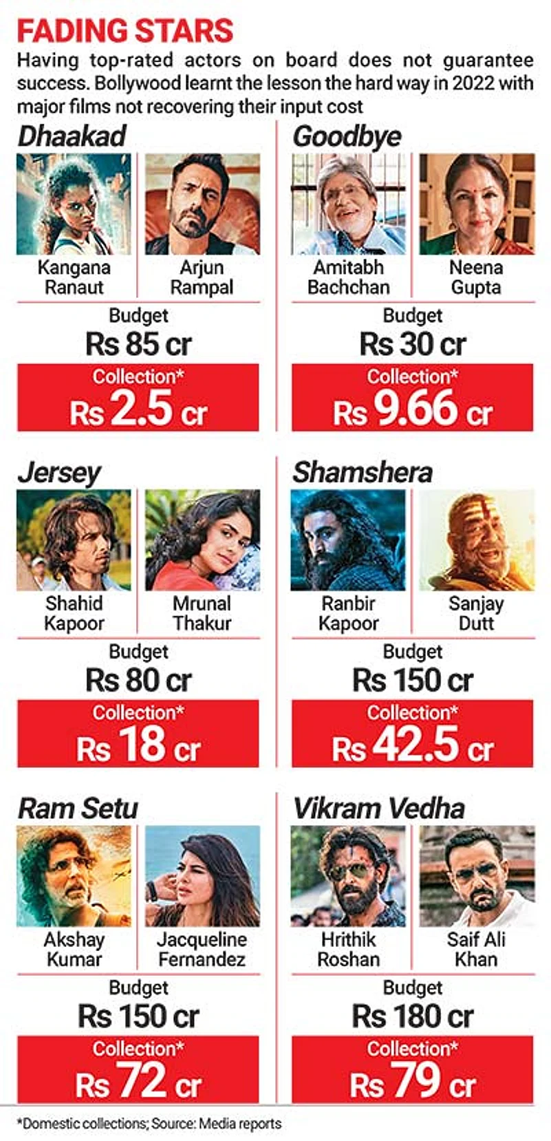 Bar Brahmastra and Drishyam 2, no big-ticket Bollywood film could impress at the box office. Aamir Khan’s Laal Singh Chaddha, Hrithik Roshan’s Vikram Vedha, Akshay Kumar’s Samrat Prithviraj, Ram Setu, Bachchhan Pandey and Raksha Bandhan and Ranbir Kapoor’s Shamshera failed to break even, ending up as either a “disaster” or a “big flop”.