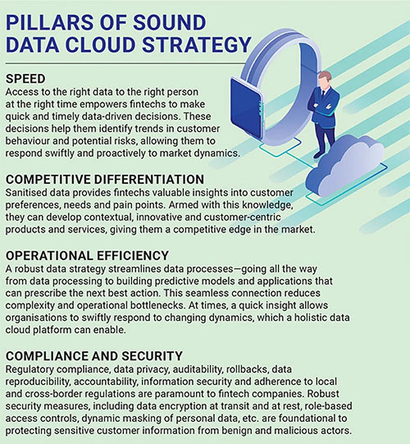 A robust data cloud comes to the rescue of fintech players in this situation. To reap the benefits of the data cloud, start-ups tend to formulate a data strategy that is fully managed, secured, governed and transparent on the go. This empowers them to make timely decisions on strategy, develop new products, improve operational efficiency and maintain regulatory compliance. With this approach, they can focus on their core business activities and innovation.