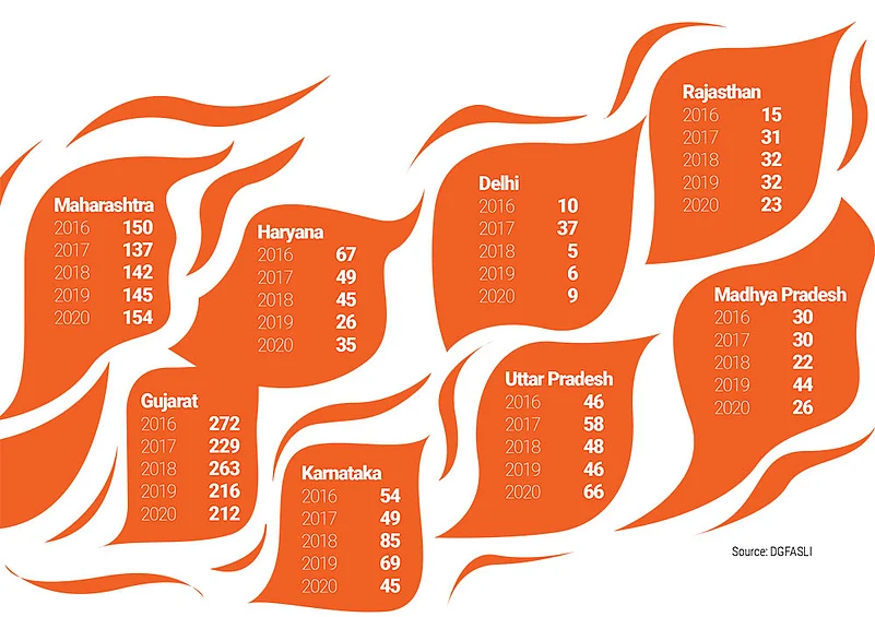 According to Section 9 of the Factories Act, factory inspectors are appointed to examine the premises, plant, machinery and other articles. They are also tasked with enquiring into any accident or dangerous occurrence, whether resulting in bodily injury and disability or not. According to the DGFASLI data, out of 1,040 sanctioned positions of factory inspectors, only 721 are currently operational. Even an industrialised state like Maharashtra lags on this count. “We have 105 positions for factory inspectors but only 30 officers in the role. A lack of human resource makes it difficult for us to carry out the inspection work,” Mukesh Patil, director of industrial safety, Maharashtra, tells Outlook Business.
