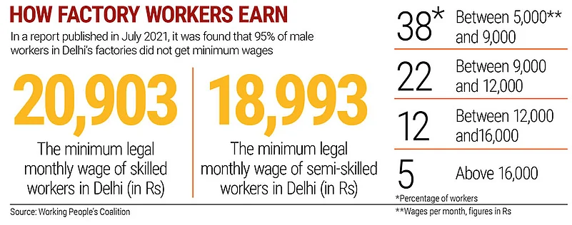 The Working People’s Coalition has analysed the wage scenario for male workers in Delhi. In a July 2021 report, it notes that 38% of them earn between Rs 5,000 and Rs 9,000, 22% earn between Rs 9,000 and Rs 12,000 and 12% earn between Rs 12,000 and Rs 16,000. Only 5% of workers it studied received stipulated minimum wages, and 95% of all workers are compelled to accept the wages offered by their employers irrespective of what regulatory bodies proclaim.