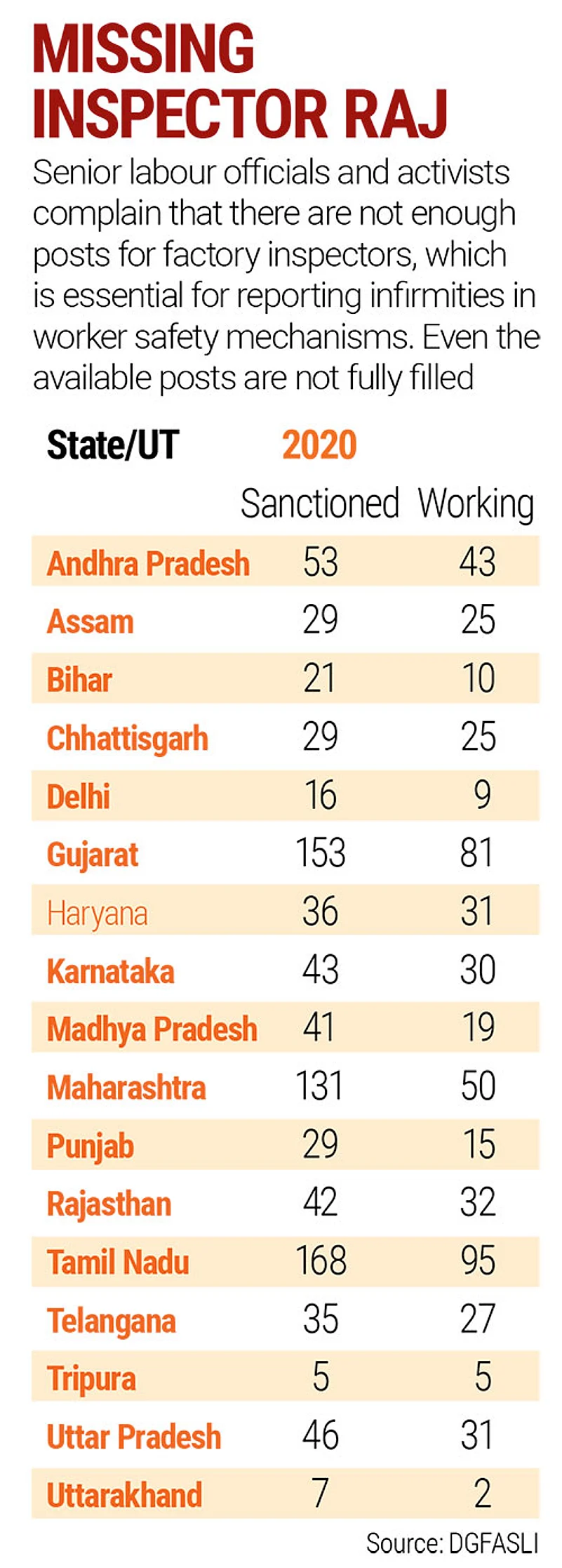 The problem of shortfall in inspection incidents has persisted over the decades. “Till 2020, out of 37,000 registered factories, we were able to do an inspection of only 15,000 factories,” a retired official from Maharashtra says on the condition of anonymity. Similarly in Bihar, out of 19 sanctioned positions of factory inspector, only nine are deployed as of now.
