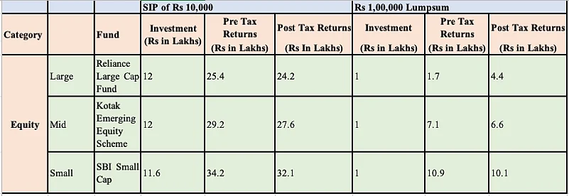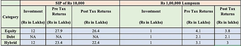 The below two tables show the pre and post-tax returns of Rs 10,000 invested through SIP 10 years ago and Rs 1,00,000 invested through lumpsum 10 years ago in both, equity and debt across different categories. The tax rate assumed for equity is 10% LTCG after exemption Rs 1,00,000 and for debt is 20% after indexation benefit.