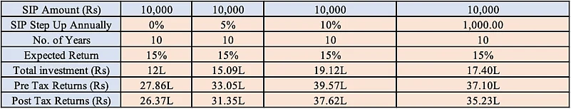 The table below shows the step-up 0%, 5%, 10% and Rs 1,000 annually on Rs 10,000 per month SIP invested for 10 years with expected returns of 15% p.a. A SIP with a step-up option earns higher returns in the same investment horizon than a SIP with no step-up option.