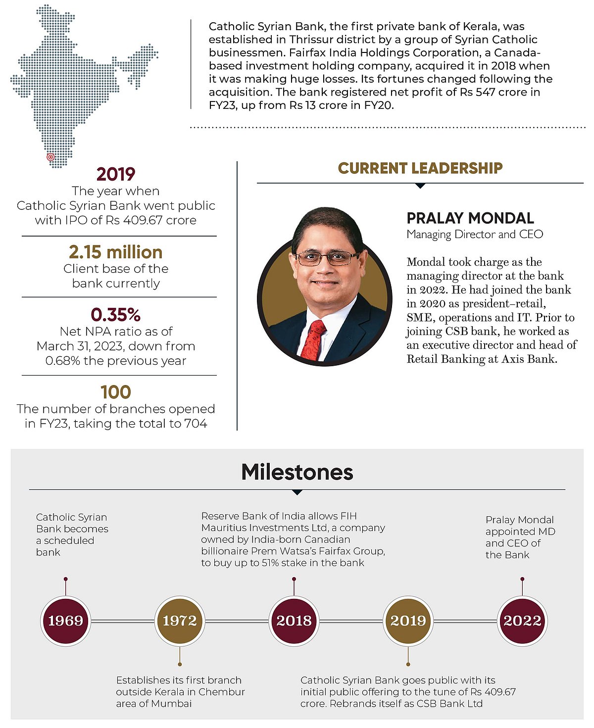 Catholic Syrian Bank, the first private bank of Kerala, was established in Thrissur district by a group of Syrian Catholic businessmen