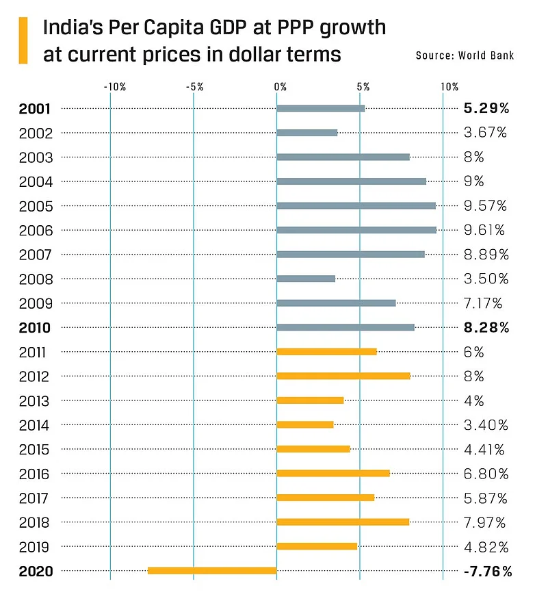 And, to be sure, the trend is not recent. The slowdown is a decade old. As per data from the World Bank, between 2011 and 2020, India’s per capita GDP calculated on purchasing power parity, at current prices in US dollar terms, compounded 4.3% annually—about half the growth of 7.2% in the preceding decade. (See chart: India’s Per Capita GDP Growth)