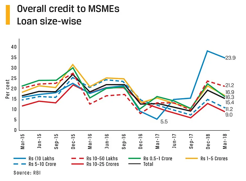 This is echoed by none other than the Reserve Bank of India. “The introduction of GST led to an increase in compliance costs and other operating costs for MSMEs as most of them were brought into the tax net,” reads a report titled ‘How have MSME Sector Credit and Exports Fared?’ by the central bank published in August 2017. Post demonetisation, the ticket size of loans to MSMEs came down drastically, it notes. Between December 2015 and March 2018, the percentage of loans in the Rs 10 million to Rs 50 million range nearly halved to 16% of the total loan book—from close to 30%. It clearly suggests that banks have been unwilling to give out large ticket size loans to MSMEs to expand their business. (See chart: Overall Credit…)