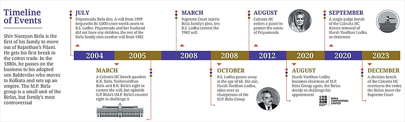 Priyamvada Birla, widow of Birla Corporation promoter Madhav Prasad Birla, died in 2004. A will from 1999 emerged bequeathing Rs 5,000 crore worth assets to chartered accountant Rajendra Singh Lodha. The Birla and the Lodha families have been at each other’s throats ever since