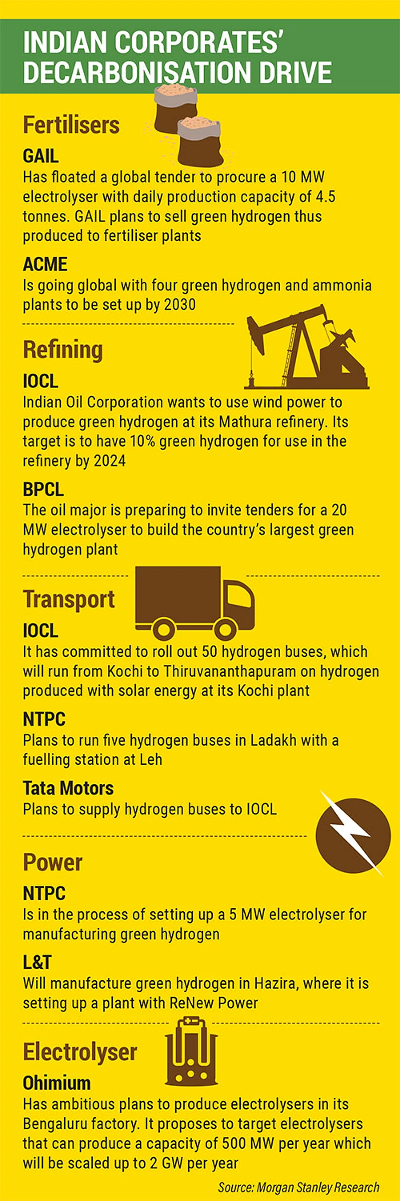 There is a frenzied action in the green hydrogen space: India’s largest refiner Indian Oil Corporation has announced partnerships with construction major Larsen & Toubro and renewable energy major ReNew Power. Other PSUs have also jumped into the fray: NTPC has floated tenders to create hydrogen fuelling stations and hydrogen blending in city gas distribution. GAIL has also floated tender for building an electrolyser capacity, while Oil India plans to set up a green hydrogen plant in Assam. At the same time, ACME India has announced green hydrogen and ammonia plants in Rajasthan and Oman, while Ohmium has announced an electrolyser manufacturing plant in Karnataka.