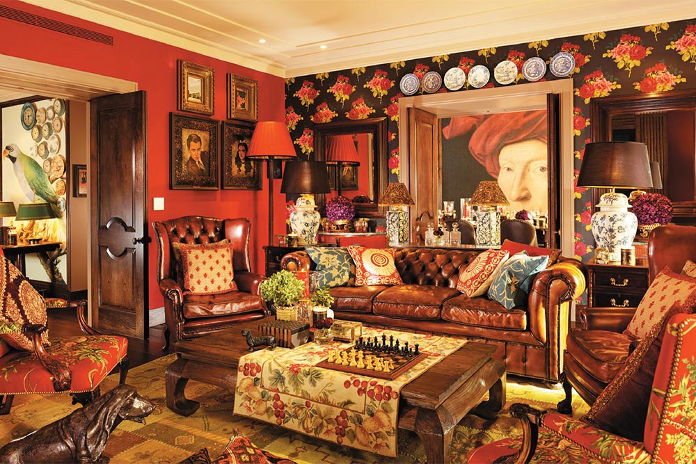 Open the door to the suite and you will be bombarded by old-fashioned luxury of the sort of room your grandfather might have kept had he been a zamindar with a passion for collecting eclectic articles. No wonder then that the rooms are filled with wonderful neo-classical furniture — Chesterfields, four-poster beds, winged chairs, partner’s desks, church furniture as well as wallpapers, paintings, cupboards, armoires, piles and piles of beautiful books everywhere, stuffed animal heads, chintzy prints and wall plates — kitsch walking hand-in-hand with high art. “We overshot the budget,” Sabyasachi giggles, “so we went to Portobello Road’s second-hand shops and I found Baccarat crystal at a throwaway price.”